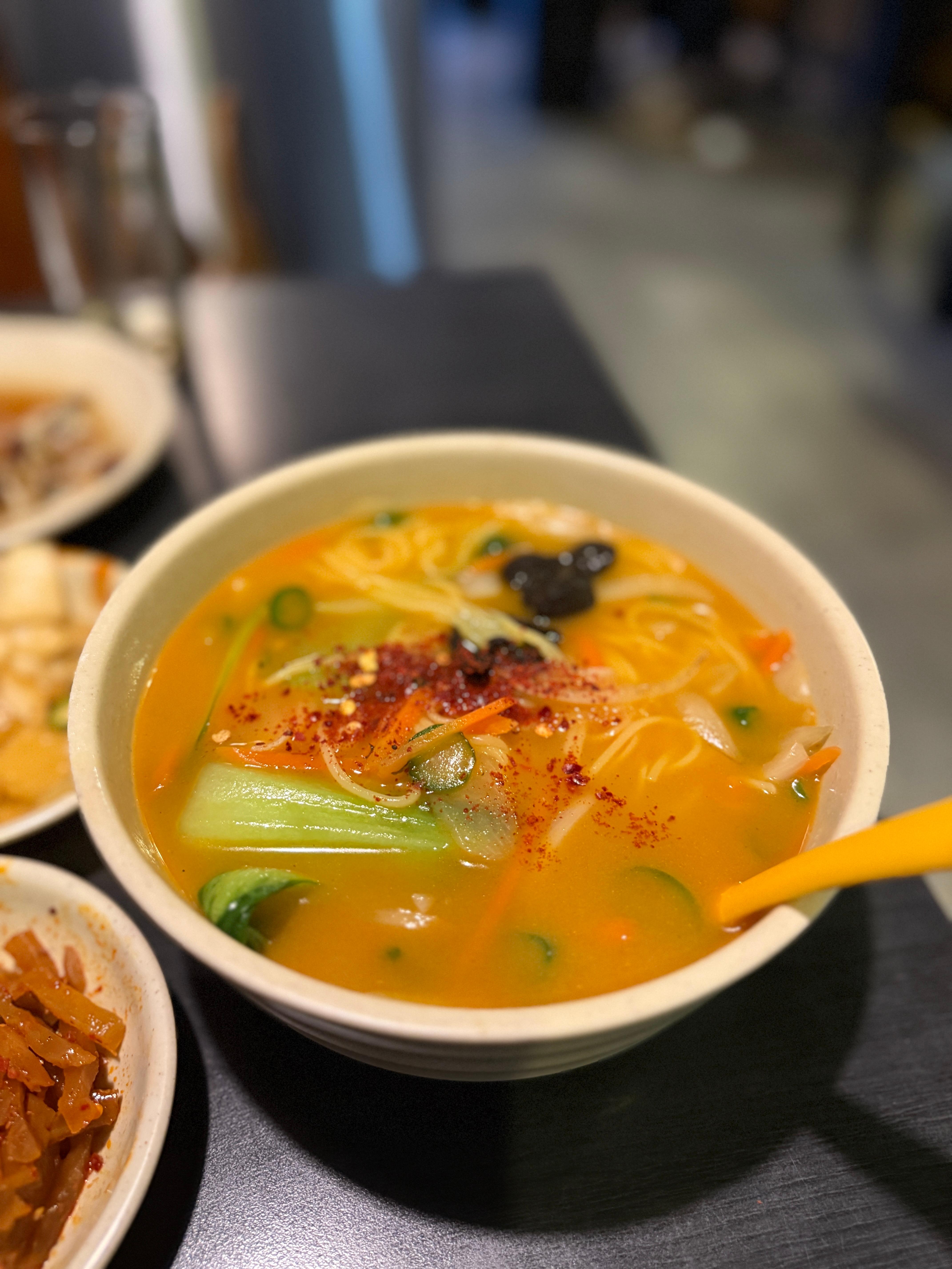 그리고 마지막 정잠은 옥수수 온면 ~~ 인천 오기전의 서울에서 먹던 온면은 콩나물국처럼 칼칼함이 강한 온면인데… 여기는 탄탄면의 국물같은 느낌이 있다. 음…. 닭뼈 육수로 만든 느낌이다(정확하게 확인해본것은 아니다). 걸죽하고 텁탑한데 구수하다. 색깔과 다르게 구수하다. 그래서 고추가루 왕창 넣고 내 입맛에 맞게 바꾸었다.