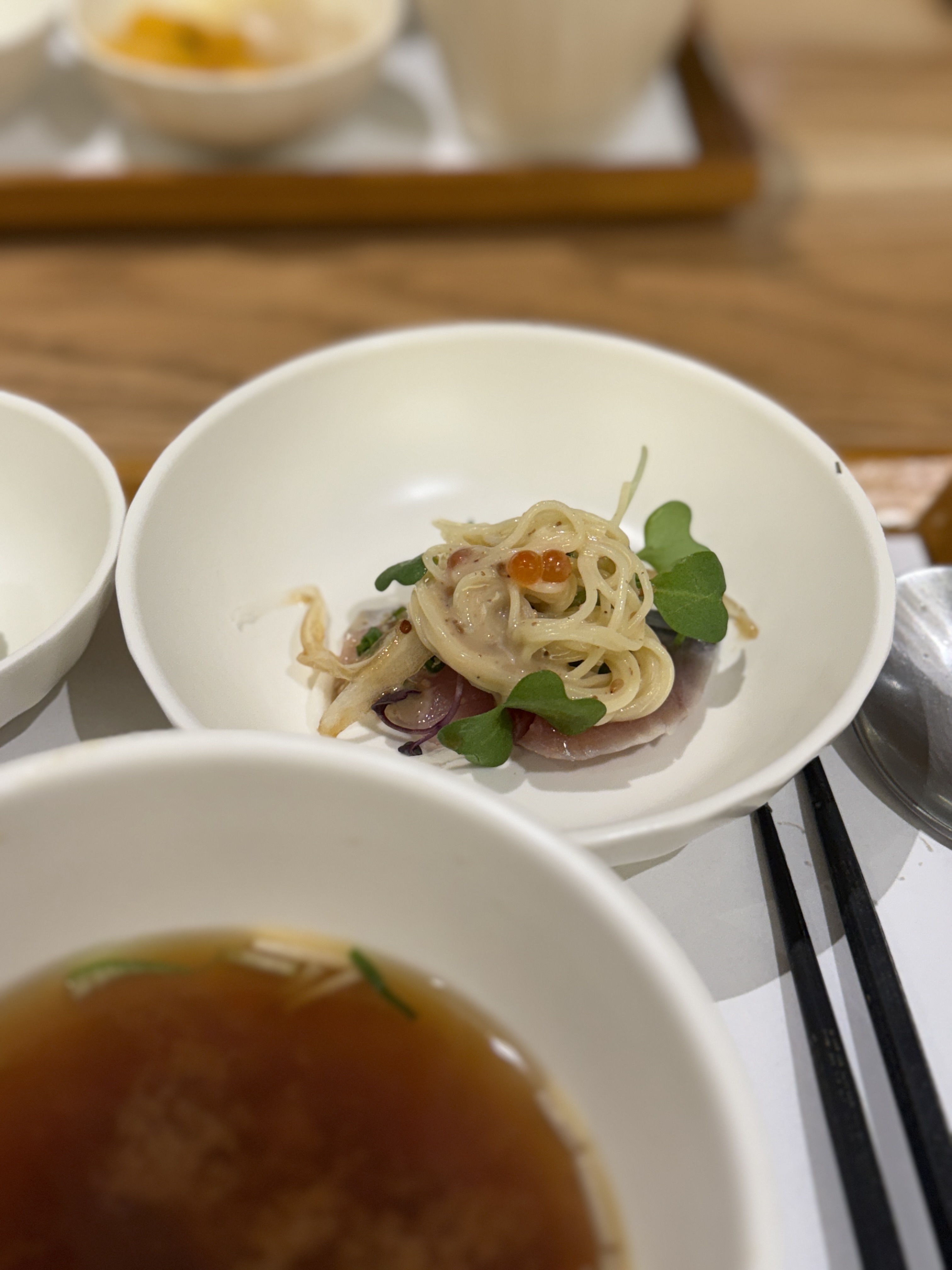 아내는 워낙 우니를 좋아해서 우니 카니 이쿠라 네기도로동을 주문하고 나는 카이센동에 여러가지먹고 싶어서 시메사바 카펠리니 샐러드를 주문했다. 여기에 화이트와인 한잔을 곁들였다. 각 메뉴에 특선 옵션은 밥의 양이 많은것을 의미하는게 아니다. 우니 또는 참치 같은 해산물 재료의 양이 일반 메뉴보다 2배정도 들어간 것이다.