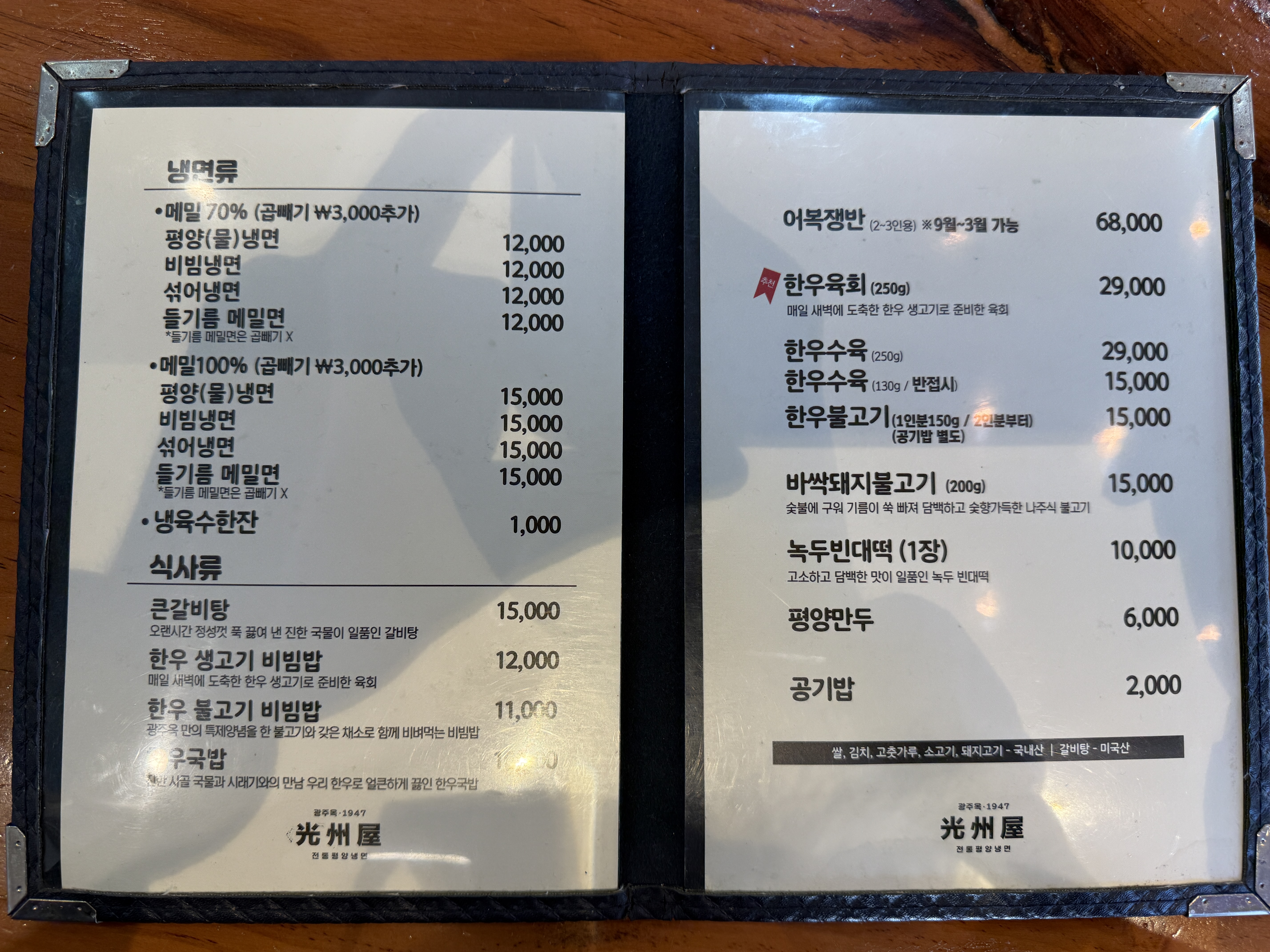 광주광역시 서구 농성동에 위치한 광주옥 1947은 이름에서 알 수 있듯이 1947년에 설립되어 오랜 전통을 이어온 평양냉면 전문점이다. 수십 년 동안 변함없이 한결같은 맛과 정성을 담아낸 이곳은 지역 주민들은 물론, 광주를 방문하는 이들에게도 꼭 들러야 할 맛집으로 손꼽히는 곳이었다. 이곳의 대표 메뉴는 평양냉면으로, 깔끔하면서도 슴슴한 육수와 쫄깃한 메밀면의 조화가 돋보인다. 육수는 고기의 깊은 향과 담백함이 어우러져 자극적이지 않으면서도 풍미가 가득하며, 메밀면은 특유의 고소함과 부드러운 식감이 좋다. 비빔냉면과 섞어냉면, 들기름메밀면도 인기 있는 메뉴로, 각자의 취향에 맞는 다양한 맛을 즐길 수 있다.