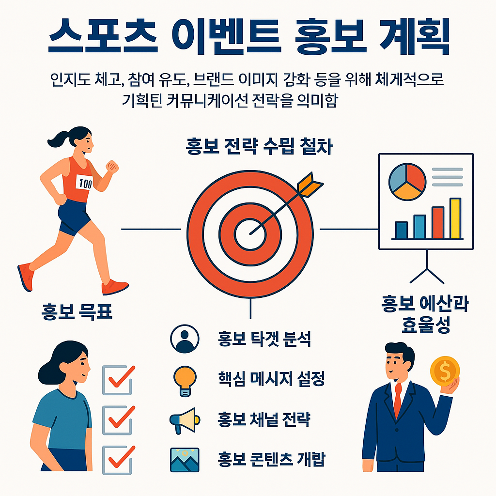 스포츠 이벤트에서 홍보 계획은 단순히 홍보물을 배포하거나 광고를 게재하는 수준에서 머무르지 않는다. 그것은 행사 개최 전 수개월 전부터 시작되어, 개최 직전에는 관심과 참여를 집중시키고, 행사 당일에는 현장감을 전달하며, 행사 이후에는 피드백과 브랜드 유지를 위한 콘텐츠로 이어지는 일련의 전략적 커뮤니케이션 과정이다. 이러한 홍보 계획은 크게 홍보 타겟의 분석, 핵심 메시지의 설정, 홍보 채널의 구성, 콘텐츠의 개발, 홍보 일정의 조율, 예산의 수립 및 관리, 성과 평가로 나눌 수 있으며, 각각의 단계에서 체계적인 접근이 요구된다.