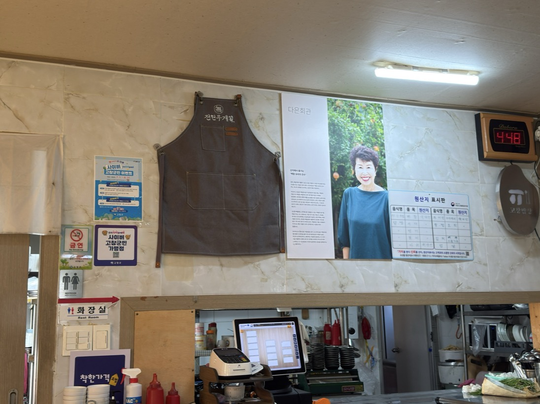 다은회관의 내부는 꾸밈없이 소박하고 정갈한 분위기이다. 나무 테이블과 의자들이 가지런히 놓여 있고, 벽에는 이 식당의 주인이자 백합 요리 명인으로 알려진 분의 사진이 걸려 있다. 식당 곳곳에는 고창의 특산물과 관련된 여러 인증서와 안내문이 붙어 있어, 이곳이 단순한 식당을 넘어 고창의 맛을 지키고 알리는 역할을 하고 있음을 보여준다.