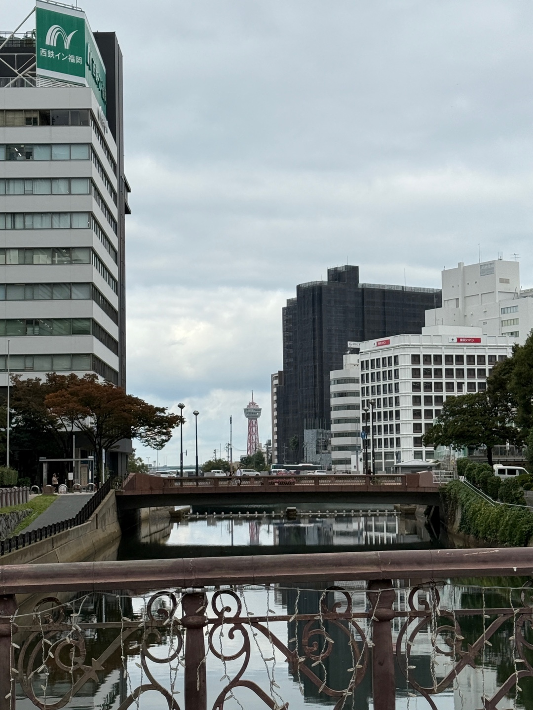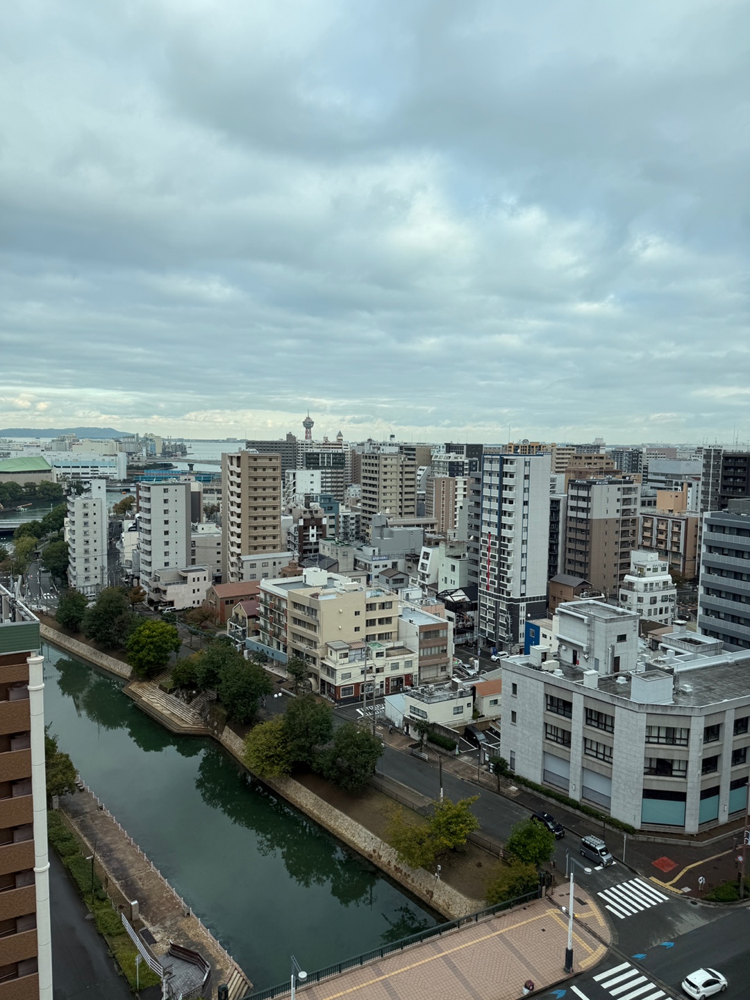 그와중에 이번에 숙박하기로한 곳은 하카타역에서 2km 떨어진 하카타강 수변에 자리잡고 있고 큰 대로와 강을 전망으로 두고 있어 여행온 기분을 도심 속에서도 충분히 즐길수 있다. 거기에 복도에 나와 윈도우 밖으로는 부산-후쿠오카 노선이 지나는 바다가 멀리보이는 풍경도 가지고 있다.