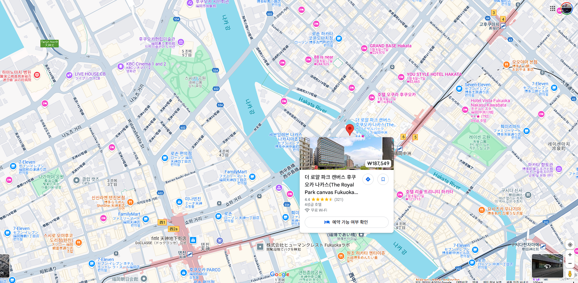 공항에서 빠져나와 미카사강을 왼쪽에 두고 고가대로 밑을 따라 10~15분 정도 달리면 도심을 가로질러 그 유명한 "이치란 라멘 본사 총본점" 가까이의 더 로얄 파크 캔버스 후쿠오카 나카스(The Royal Park canvas Fukuoka Nakasu) 호텔에 도착한다. 때마침 일요일 오후부터 비가 내리기 시작해 상쾌한 여행의 시작은 아니었으나 위치가 강 바로 옆이어서 분위기는 좋겠구나 싶었다. 시기에 따라 또는 예약 플랫폼의 조건에 따라 다르지만 2인 기준 1박 15~20만원 사이에 예약이 가능하고 손님이 아주 많은 시기에 30만원 대가 된다.