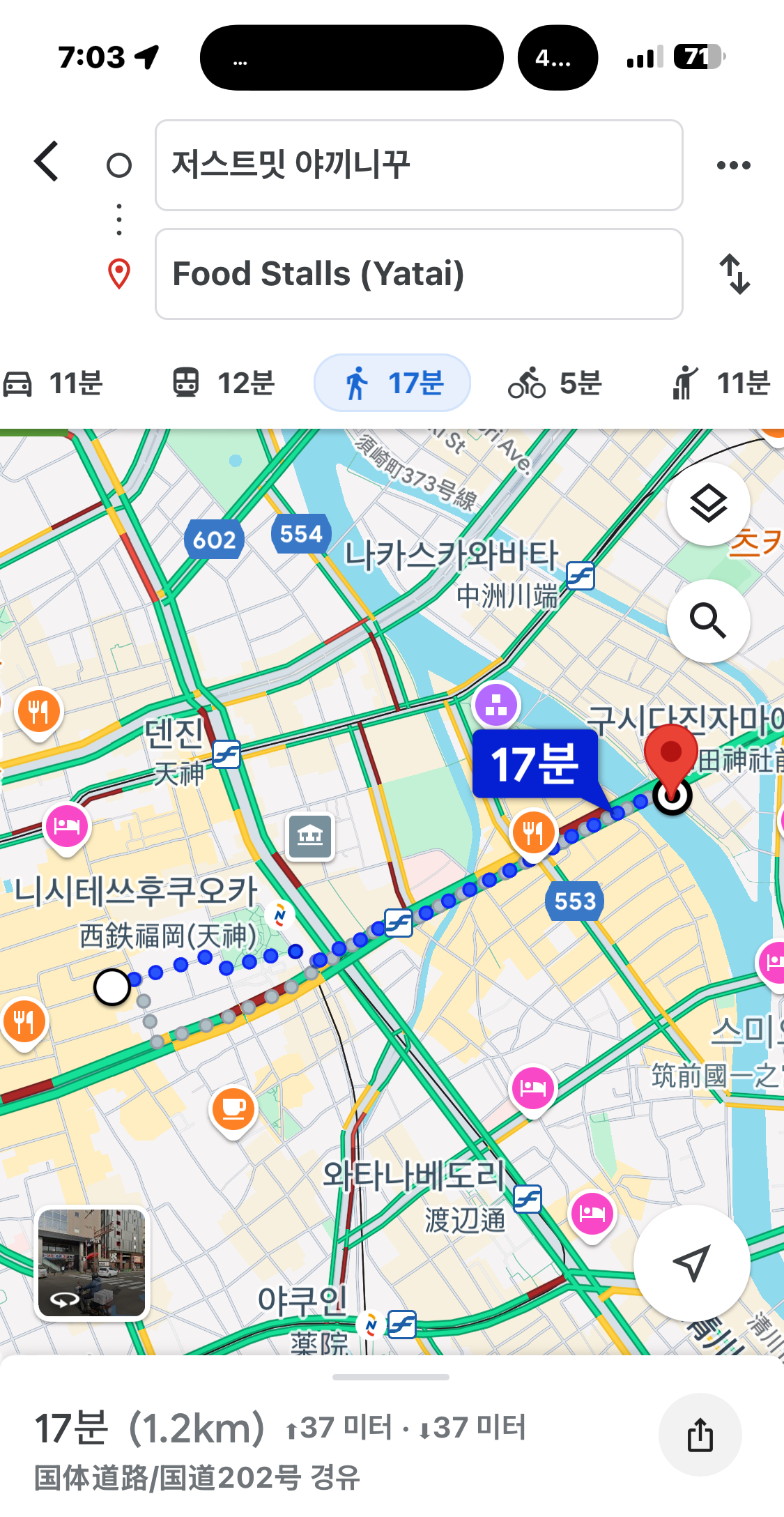 구글맵에서 후쿠오카 포장마차거리 food stalls 를 검색해도 되고, 포장마차 탄룡 을 검색해도 된다. 야끼니꾸를 먹은 저스트밋에서는 17분 걸리는 도보 거리이다. 후쿠오카의 맛집 여행의 장점은 그저 걸어서 모든 맛집을 다닐수 있다는 것~~^^