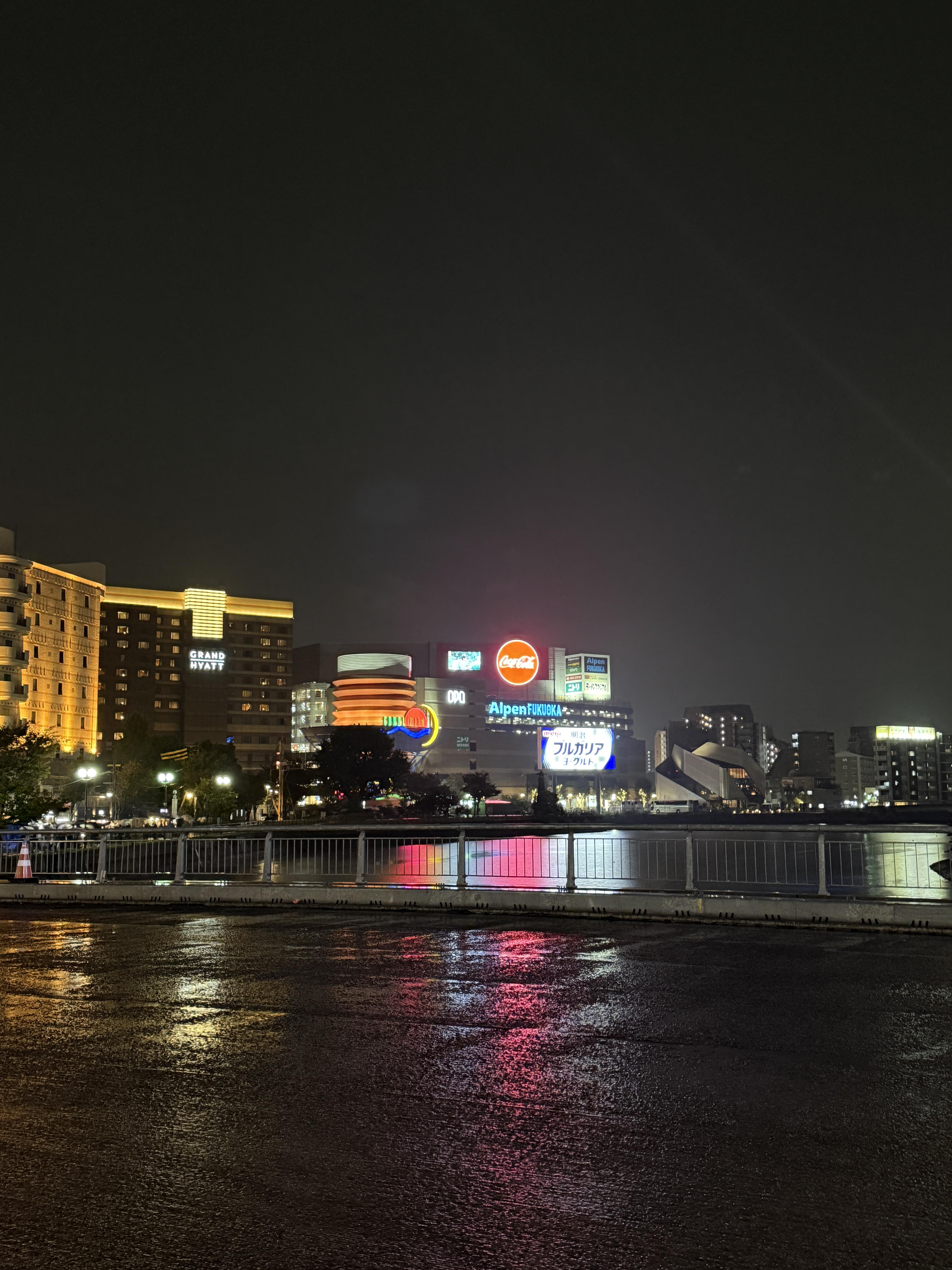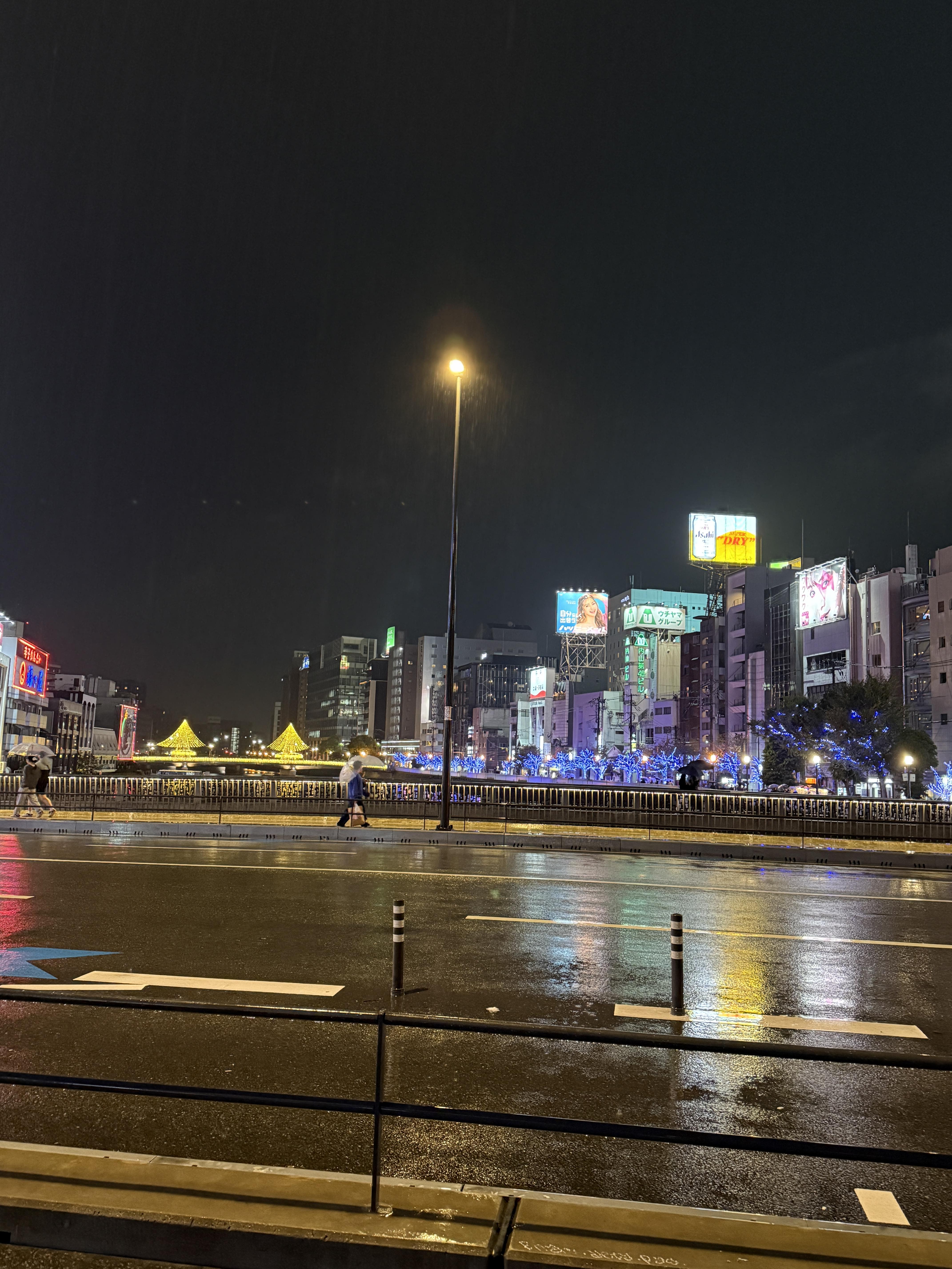 비내리는밤 우산에 가려 있어도 나카강변을 따라 늘어선 낮은 빌딩들 옥탑의 광고 네온사인이 크리스마스 트리는 뼈도 못추리게 이쁘다. 역시 이것 또한 일본 특유의 감성이리라.