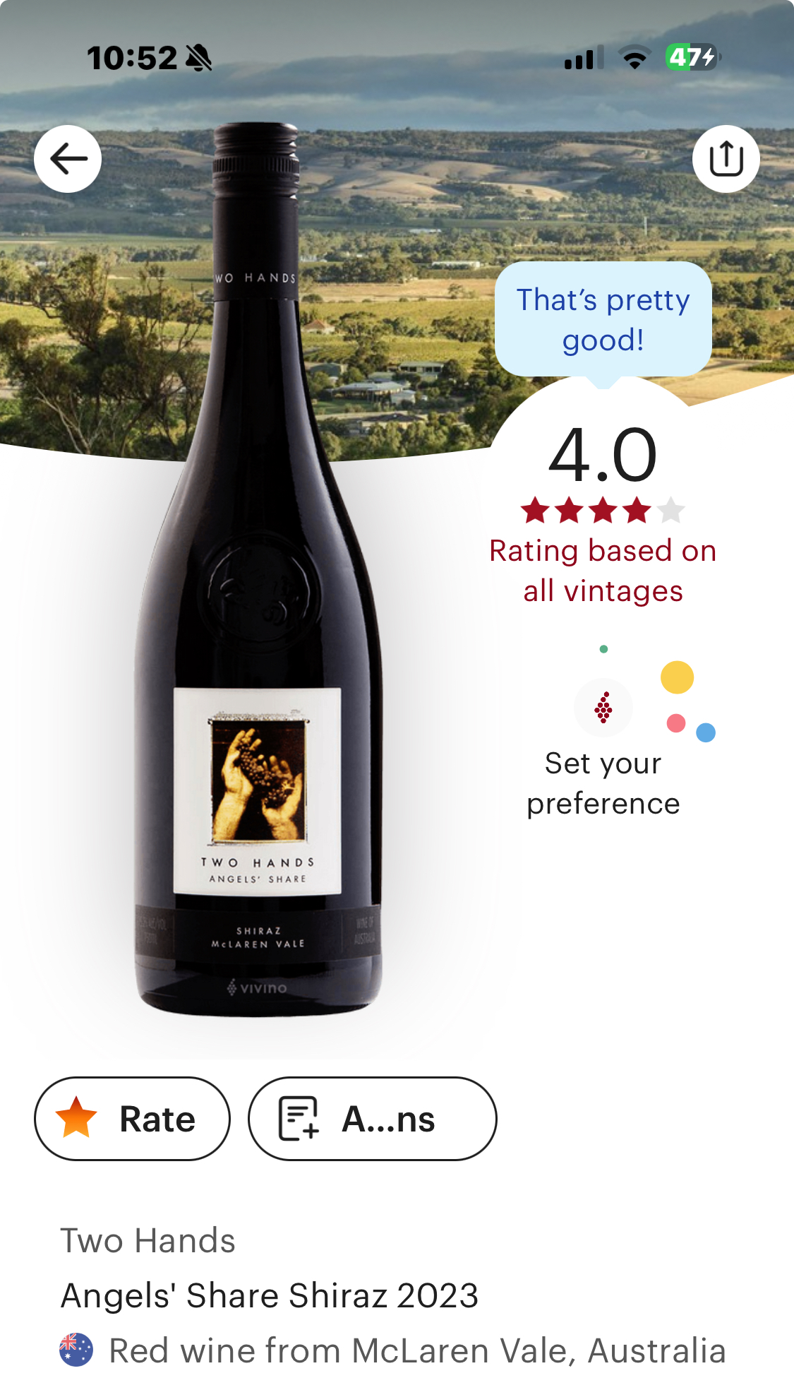 ‘Two Hands Angels’ Share Shiraz’는 호주 맥라렌 베일(McLaren Vale) 지역에서 생산되는 쉬라즈 품종의 레드 와인이다. 이 와인은 풍부한 과일 향과 부드러운 질감이 잘 느껴진다. 시원한 부드러움 보다는 정말 아주 시원한 과일 쥬스 깉은 느낌이다. 블루베리, 블랙베리, 자두 등의 진한 과일향이 강하고 아로마와 은은한 페퍼 향이 목넘김의 끝에서 나타난다. 또한 달콤한 향신료의 조화도 느껴진다.