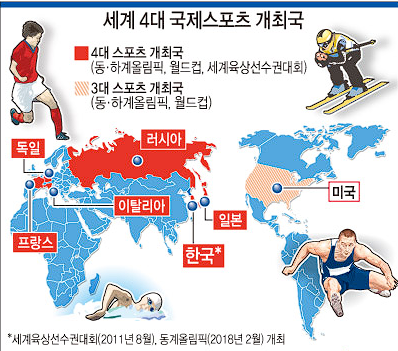 - 한국은 1988년 서울 하계 올림픽, 2002년 FIFA 월드컵, 2011년 세계육상선수권 대회, 2018년 평창 동계 올림픽을 모두 개최하며, 전 세계에서 네 가지 메이저 국제 스포츠 행사를 개최한 소수 국가 중 하나로 자리매김하였다. 이는 한국이 경제적, 사회적으로 선진국에 진입했음을 국제사회에 알리는 상징적 성과로 평가받았으며, 글로벌 스포츠 산업 및 관광 산업 활성화에도 기여하였다.