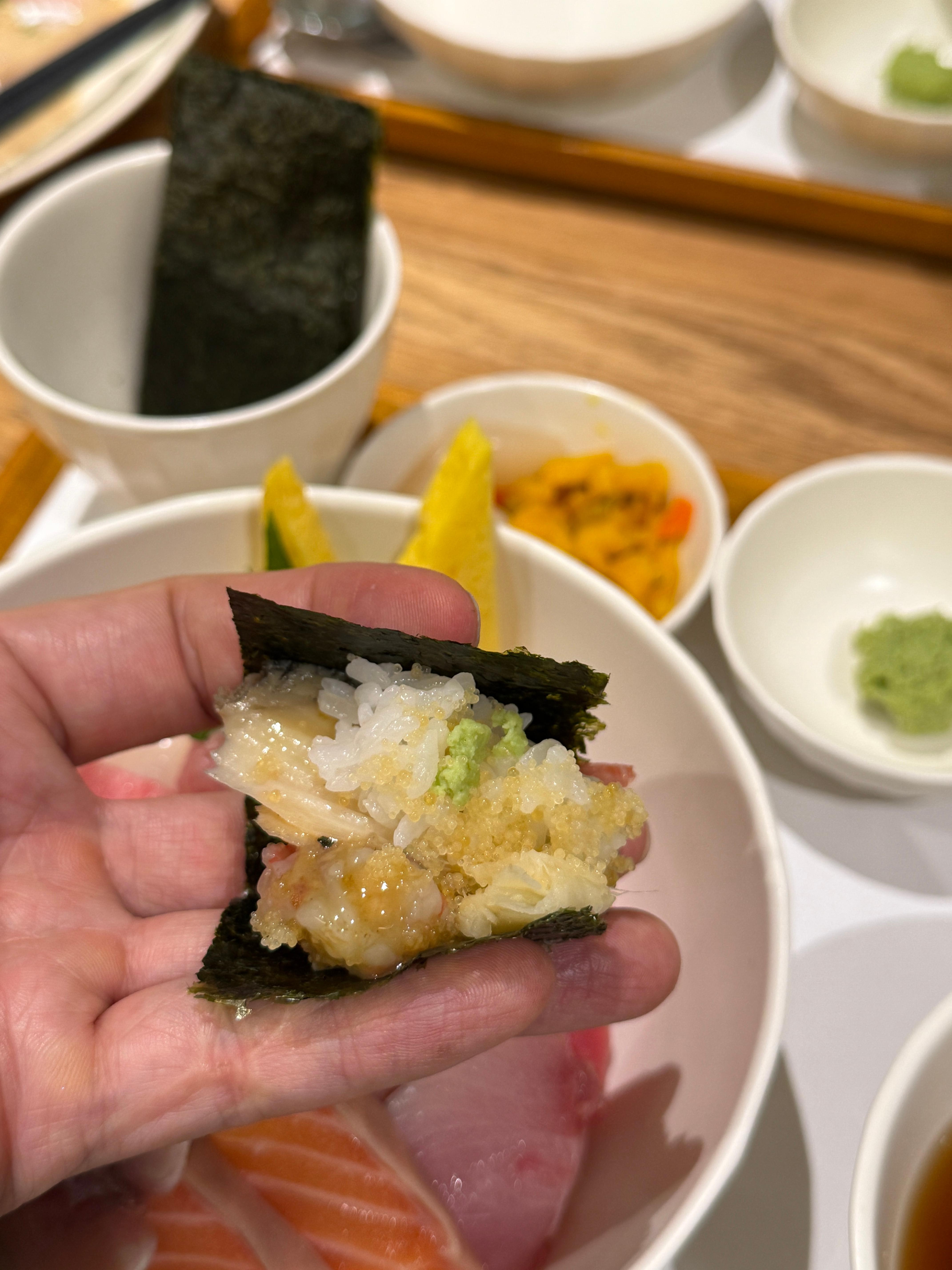 이후에 참치 다진 것과 날치알, 우니와 간장에 빕 전체 잘 비벼 먹으면 아주 배부르게 한가득 먹게된다.