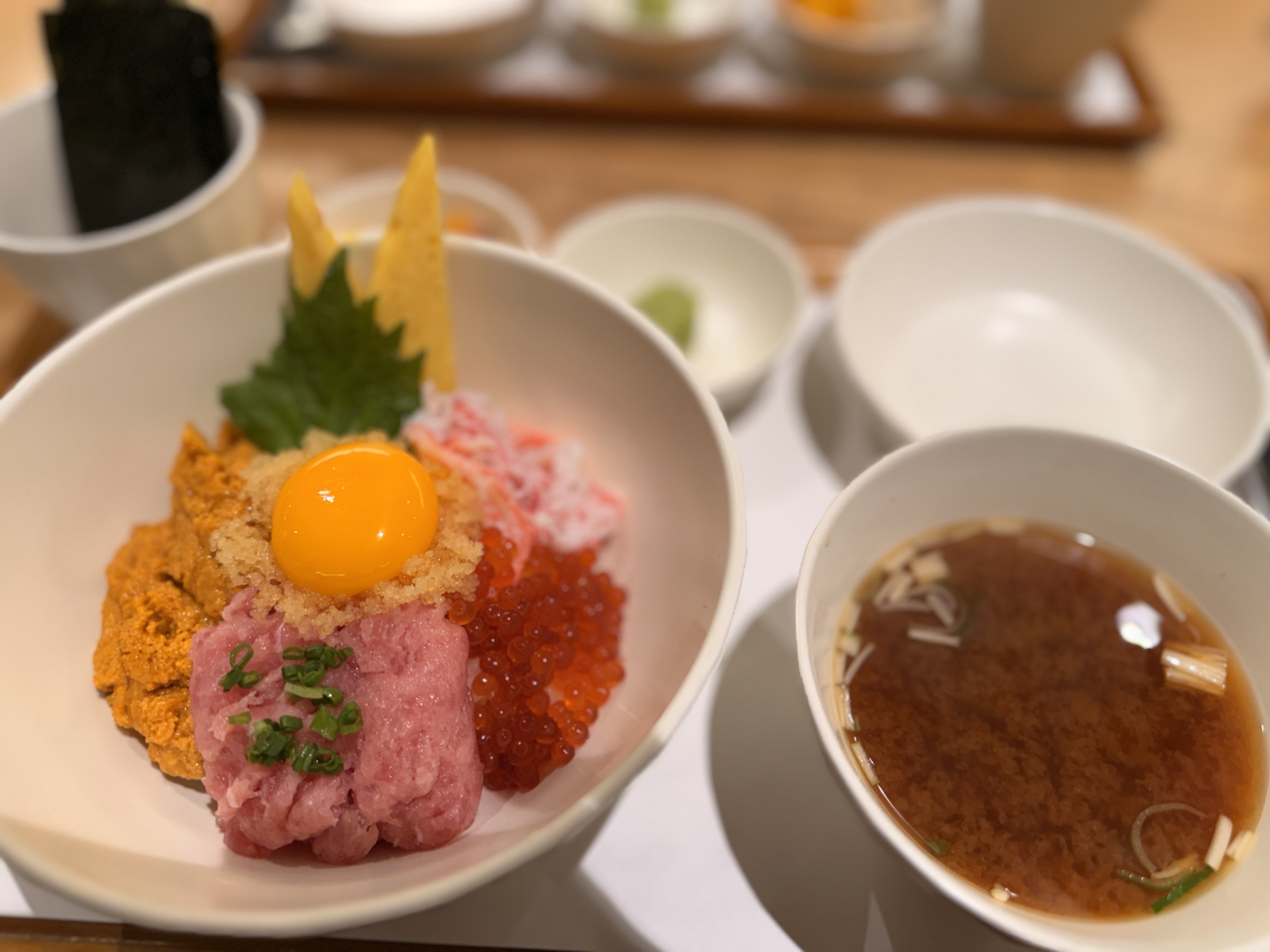 아내는 워낙 우니를 좋아해서 우니 카니 이쿠라 네기도로동을 주문하고 나는 카이센동에 여러가지먹고 싶어서 시메사바 카펠리니 샐러드를 주문했다. 여기에 화이트와인 한잔을 곁들였다. 각 메뉴에 특선 옵션은 밥의 양이 많은것을 의미하는게 아니다. 우니 또는 참치 같은 해산물 재료의 양이 일반 메뉴보다 2배정도 들어간 것이다.