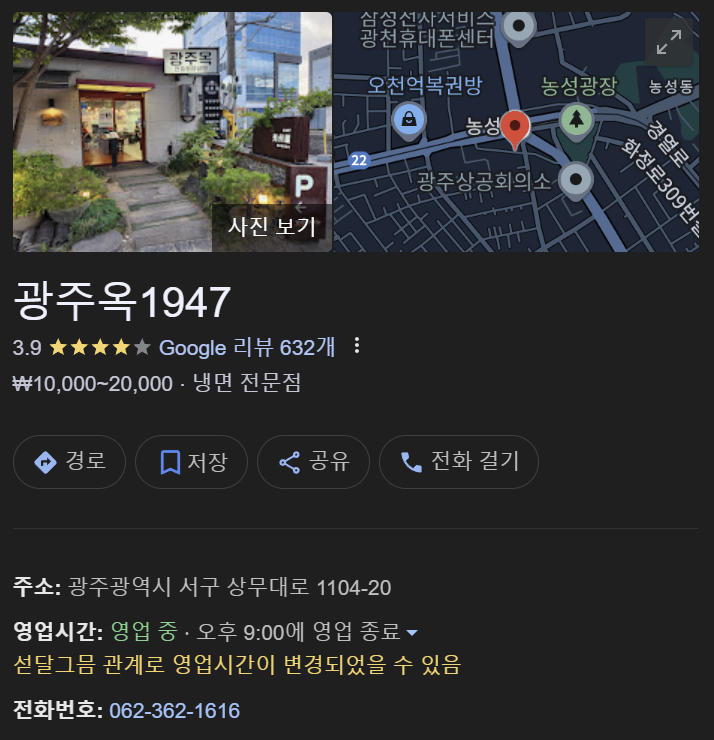 광주옥 1947은 매일 오전 11시부터 오후 9시까지 운영하며, 오후 3시부터 5시까지는 브레이크 타임이 있으니 방문 시 참고해야 한다. 위치는 광주광역시 서구 상무대로 1104-20으로, 접근성이 뛰어나 광주를 찾는 누구라도 쉽게 방문할 수 있을 듯하다.