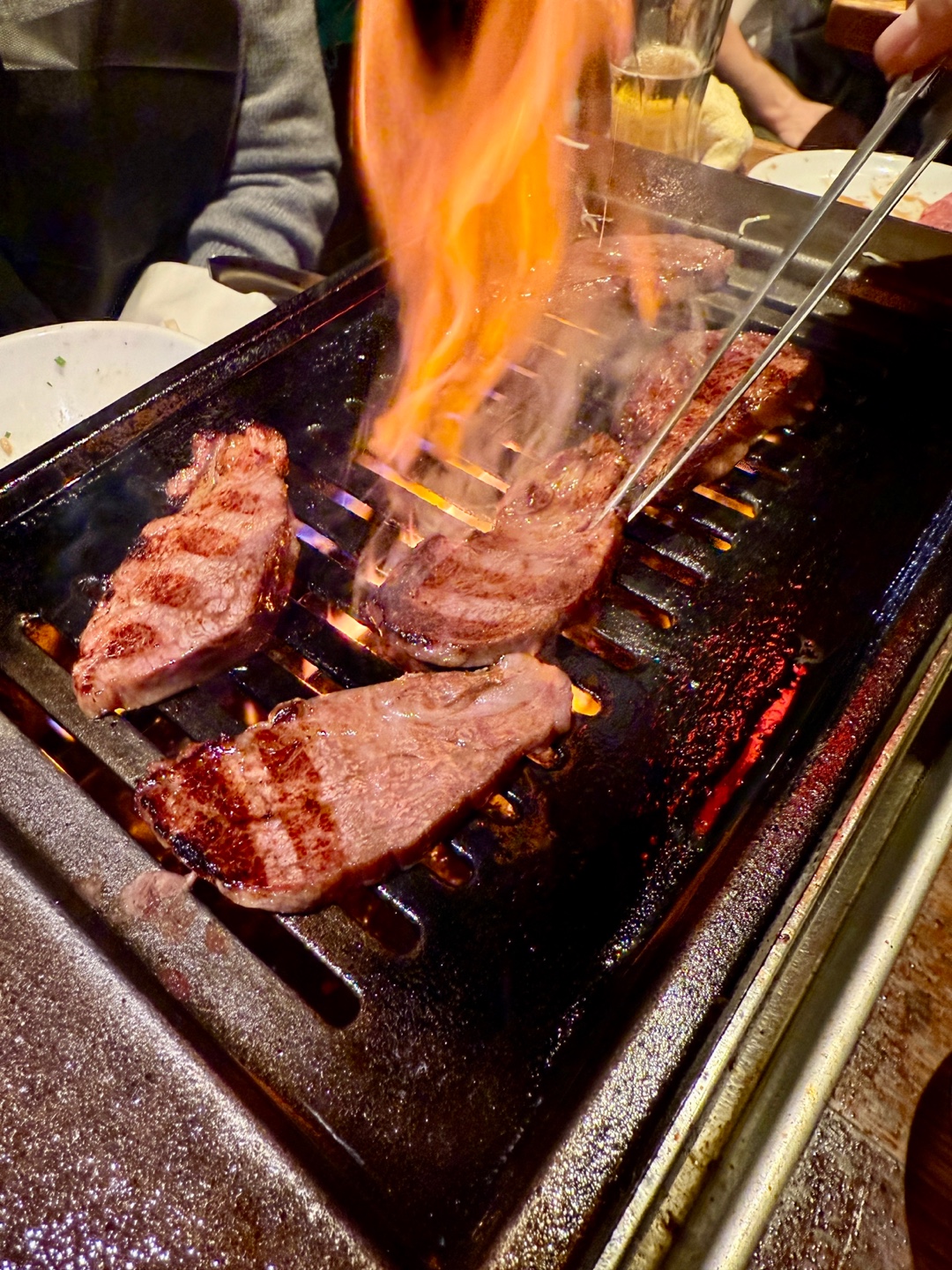 야끼니꾸(焼き肉)는 일본어로 "구운 고기"라는 뜻으로, 일본에서 즐겨 먹는 고기 요리 스타일 중 하나이다. 일반적으로, 다양한 종류의 고기를 작은 조 각으로 잘라 테이블에 놓인 숯불이나 가스 그릴에서 직접 구워 먹는 방식이다. 후쿠오카 다이묘 지역에 있는 한 식당에서 야끼니꾸를 저녁식사로 즐겼는데 먼저 야끼니꾸의 특징과 관련된 몇 가지 포인트는 알고가자.