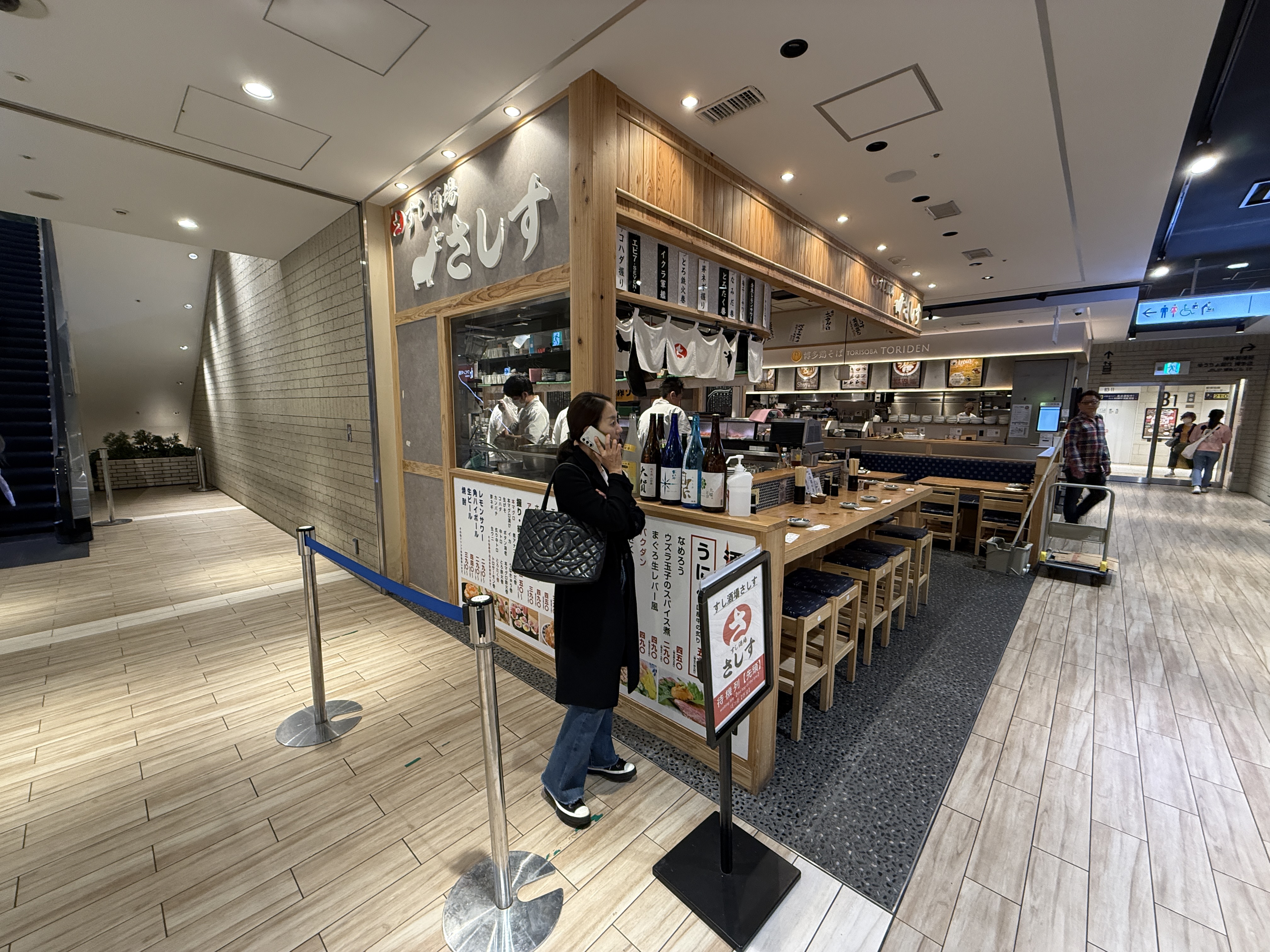 찾아갔던 킷테하카타점은 하카타역 지하 1층 쇼핑몰 겸 푸드코드 킷테에 위치한다. 하카타역 건물을 정면으로 바라보고 오른쪽 끝의 에스컬레이터를 타고 내려가면 킷테 푸드코트 입구가 오른쪽에 있다. 입구를 들어가면 스타벅스가 보이고 스타벅스를 왼편에 두고 복도를 따라 걸어가면 백화점에서 내려오는 에스컬레이트가 보인다 그바로 옆으로 보이는 줄서는 라인이 있다면 바로 스시사카바 사시스 킷테하카타 점이다.
