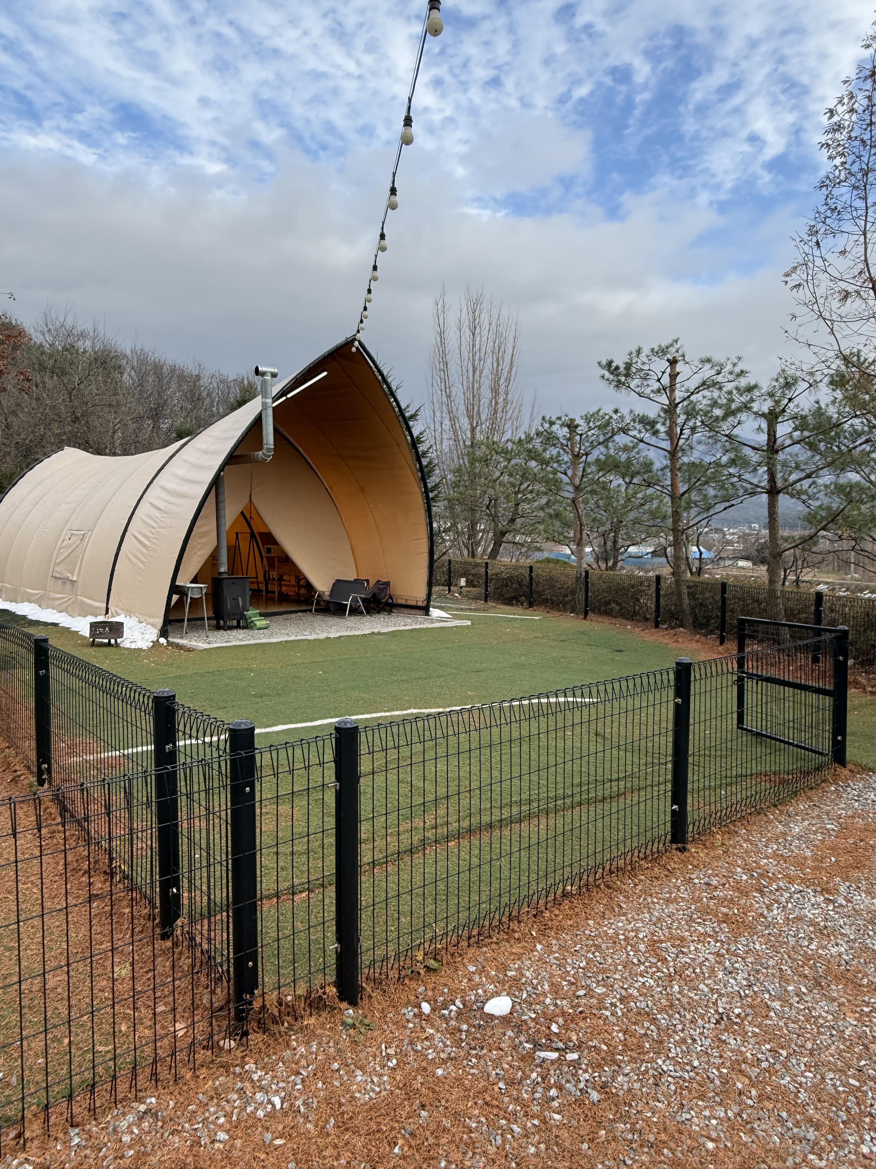 텐트밖이나 울타리에 범위를 두지 않고 텐트안 침실까지 입장 가능한 글램핑장을 찾고찾아 드디어 갔다.
