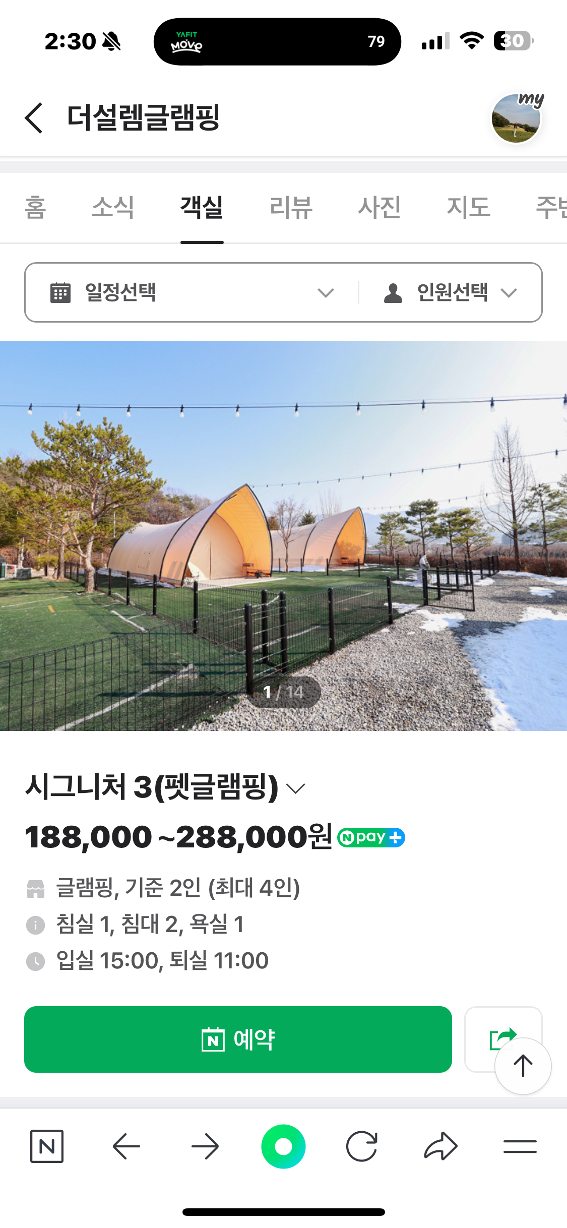 • 펫 글램핑 시그니처 객실에서는 반려견 동반이 가능하며, 1박당 추가 요금이 부과된다.