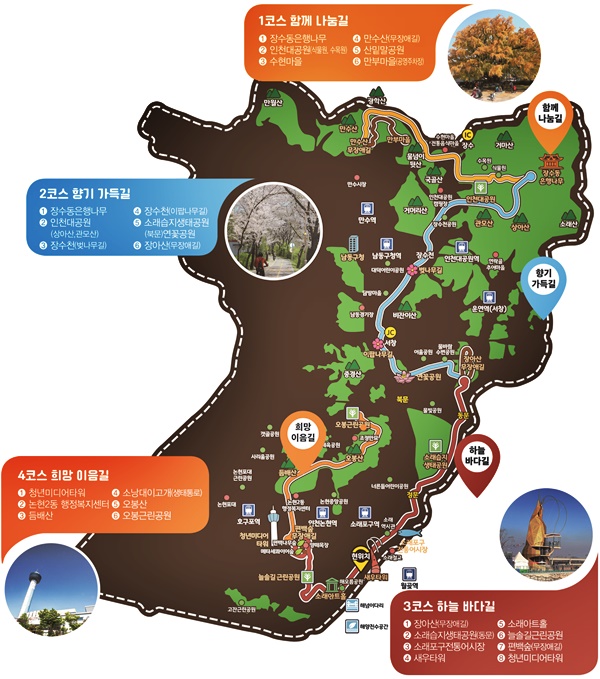 인근 거주 주민들의 생활을 개선하고 관광객들에게 좋은 환경을 제공하기 위해 남동구의 아름다운 자연과 문화자원을 널리 알리고, 구민들의 건강한 여가생활을 위해 6개의 산과 무장애나눔길 3개 노선, 하천과 바다를 연결한 총 33.5km 규모의 도보 관광코스가 만들어 졌다. 특히 최근 러닝붐에 의해 이 코스 중 제3코스인 하늘바다길은 정말 최고의 풍경을 자랑한다.